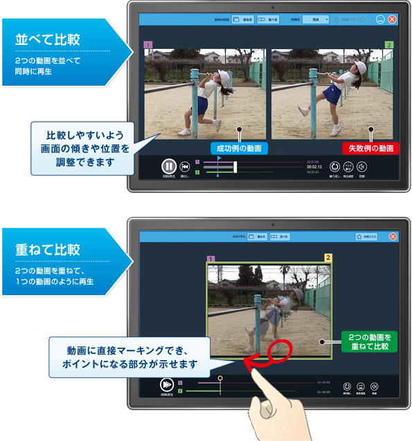 2つの動画を並べたり重ねたりして、比較しながら再生できます。理科の実験や体育の実技などで、目に見える形で違いを確認できます。2つの動画の再生開始位置を合わせたり、再生スピードの調整も可能です。