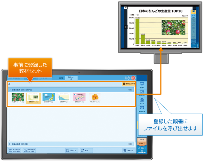 授業で提示する順番に教材ファイルを登録して、「教材セット」として保存します。画像だけでなく、PowerPointやExcelなどのファイルも登録でき、授業の進め方どおりにファイルを並べておけます。