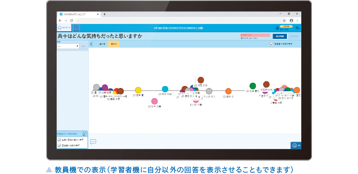 子どもたちが考えを共有できるように、全員の回答を表示することができます。自分とは異なる意見を参考にして、考えが変わったときには何度でもマーカを再配置することができ、その結果もリアルタイムに反映されます。