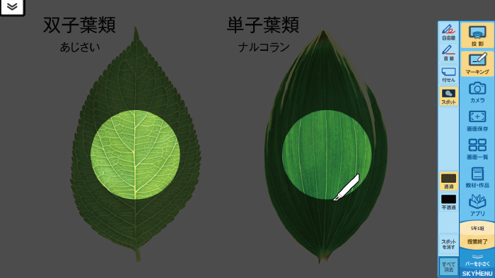 特に注目させたい箇所を、スポットライトのように強調して提示できます。教材を完全に隠さないので、全体の中のどの部分に注目すればよいか、わかりやすく提示できます。