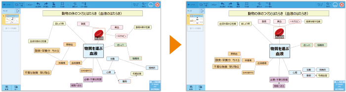 元となるテーマに関連するキーワードや画像をクモの巣状につなげていくことで、子どもたちが自分の思考を可視化できるマッピング機能。タブレット端末なら編集が簡単にできるので、試行錯誤しながら自由に発想を広げられます。