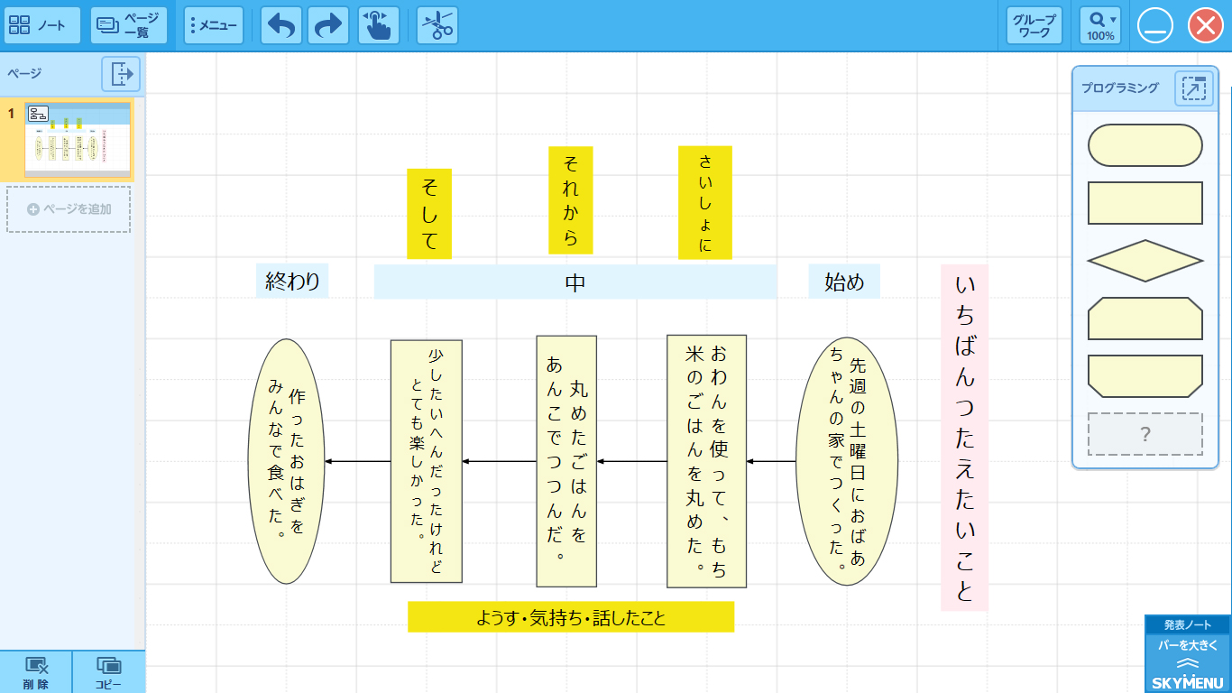 SKYMENU Classは「主体的・対話的で深い学び」を目指し、子どもたちが試行錯誤しながら考えを深めていく学習活動をサポートします。SKYMENU Class 2018では、プログラミング的思考の育成に役立てられる機能を追加するなど、学習活動で使える「思考ツール」を充実させました。